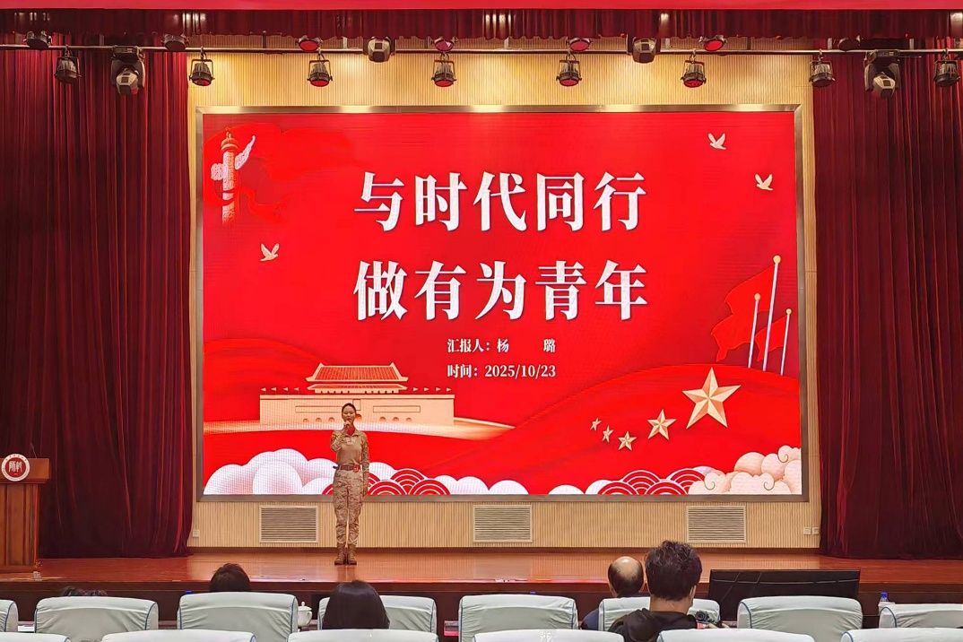 决赛现场,杨璐同学首先回顾了青年时期的李大钊、周恩来和鲁迅,是他们扛起了民族救亡的重担。并回顾了自己的曾祖父,参加抗美援朝战争在身体上留下层层伤疤,亲身感受到这一代人以血肉之躯筑起中华民族的钢铁长城。第二部分结合自身实际,回顾了自己五年的军旅生活,不仅锻炼了她强健的体魄,更让她读懂了理想与信仰、坚持与责任。现在身为大学生的她,还有另一个身份——民兵。9月3日,作为民兵方队一员走过天安门广场,接受检阅。她说:“当和那些‘最可爱的人’在一起,自豪感与使命感总会油然而生”。相信在未来前进的道路上,她一定会不忘初心,用实际行动书写零零后的责任与担当。最后,杨璐同学呼吁新时代的有为青年无需人人惊天动地,但必有赤诚初心。接过先辈的火炬,与时代同行,做有为青年,在祖国需要的地方绽放最美的青春之花!