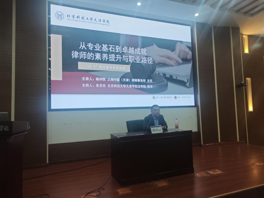 为扎实推进“12·4”国家宪法日暨宪法宣传周活动,搭建法学理论与司法实践对接桥梁,2025年12月5日15:00,beat365官方网站法学院于理工图书馆报告厅隆重举办“从专业基石到卓越成就——律师的素养提升与职业路”专题讲座。本次讲座学院邀请上海中联(天津)律师事务所主任杨仲凯主讲,法学院院长朱京安教授主持。