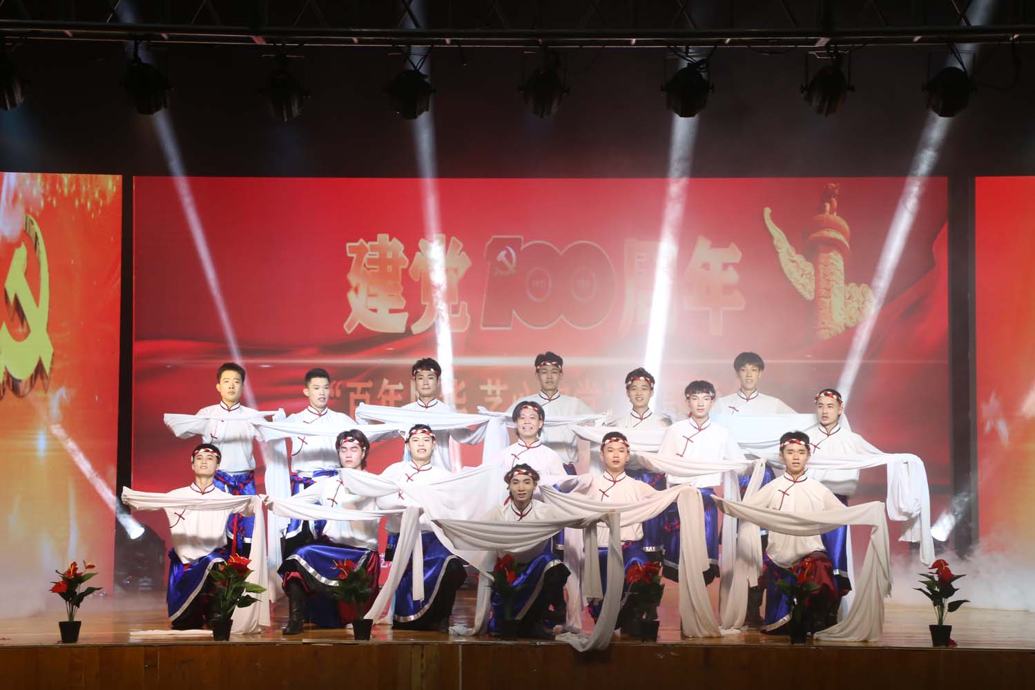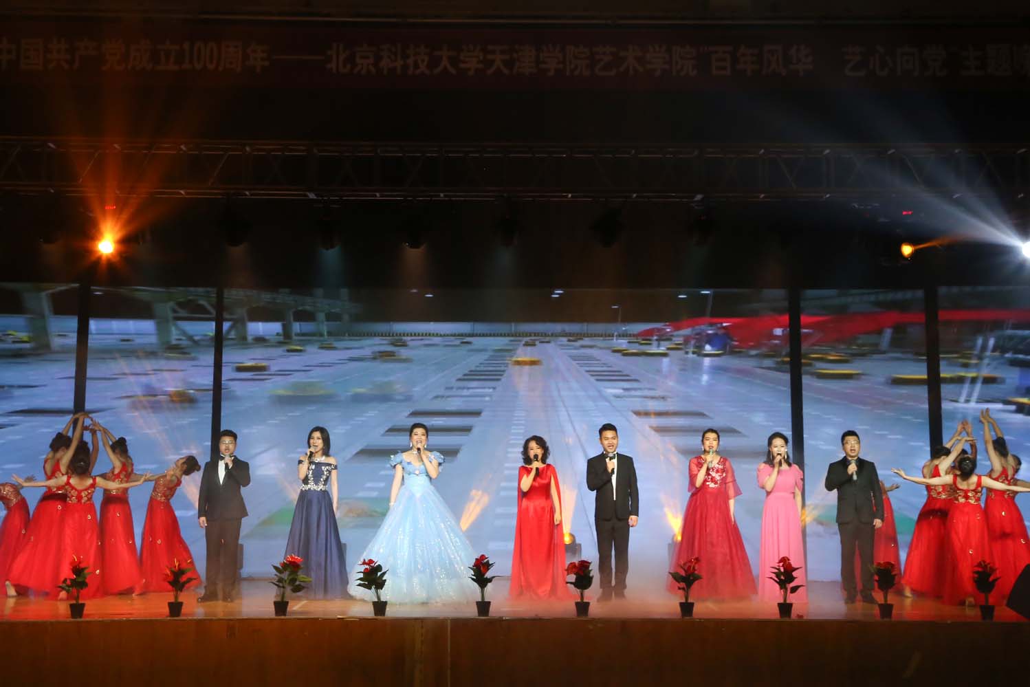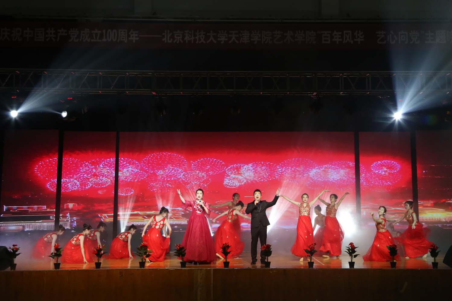 开场歌伴舞《复兴的力量》,由艺术学院教工第一党支部书记任琦琦、音乐系教师刘心纯演唱,舞蹈系教师柳明、白宇指导,舞蹈系学生伴舞。节目整体气势恢弘,拉开了整场晚会的序幕。