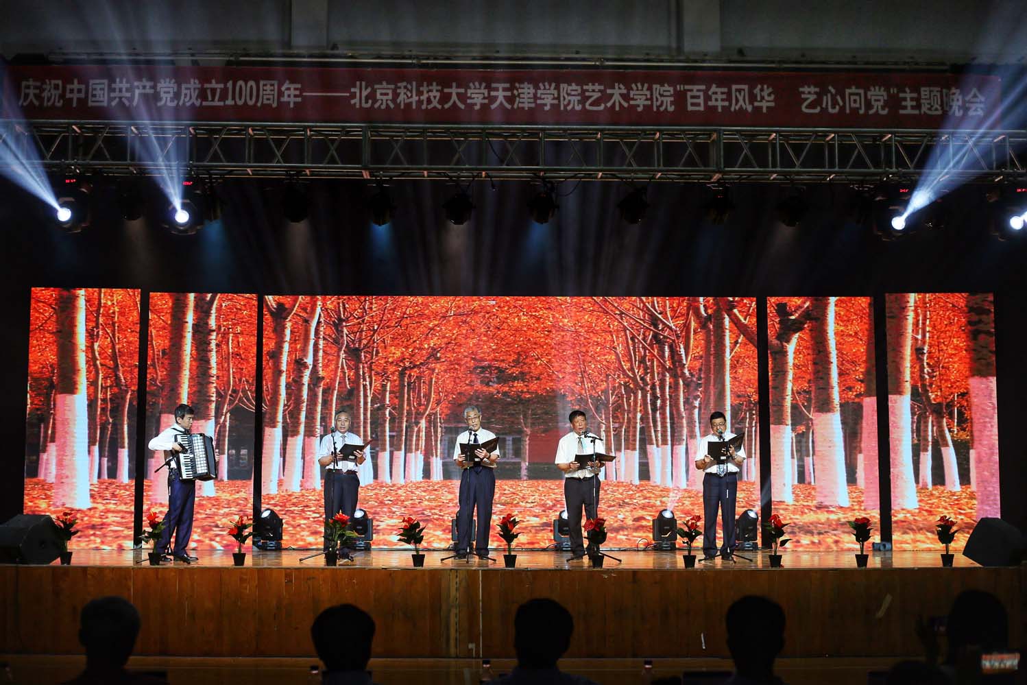由艺术学院院长胡宝嘉、教务处长张建华、体育部主任吴铁桥、城市建设学院院长刘胜富、音乐系常务副主任何继强带来的小合唱,将整场晚会推上了高潮。“闪亮的青春”组合,彰显了共产党人的昂扬风貌,迈进新征程、奋进新时代的精气神,激发了艺术学院全体师生风雨无阻、砥砺前行的强大精神信念。