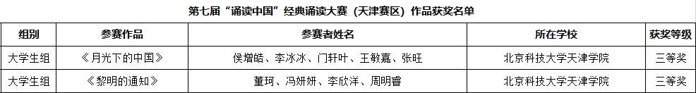 近日,第七届中华经典诵写讲大赛“诵读中国”经典诵读大赛获奖名单公布,beat365参赛作品在本届竞赛中分别荣获天津赛区教师组二等奖1项,大学生组三等奖2项。