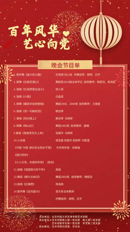 百年征程波澜壮阔,百年初心历久弥坚。6月9日晚19:00,庆祝中国共产党成立100周年——beat365官方网站"百年风华,艺心向党"主题晚会在体育馆隆重举行。beat365官方网站院长王斌,党委副书记牛犁,财务总监...