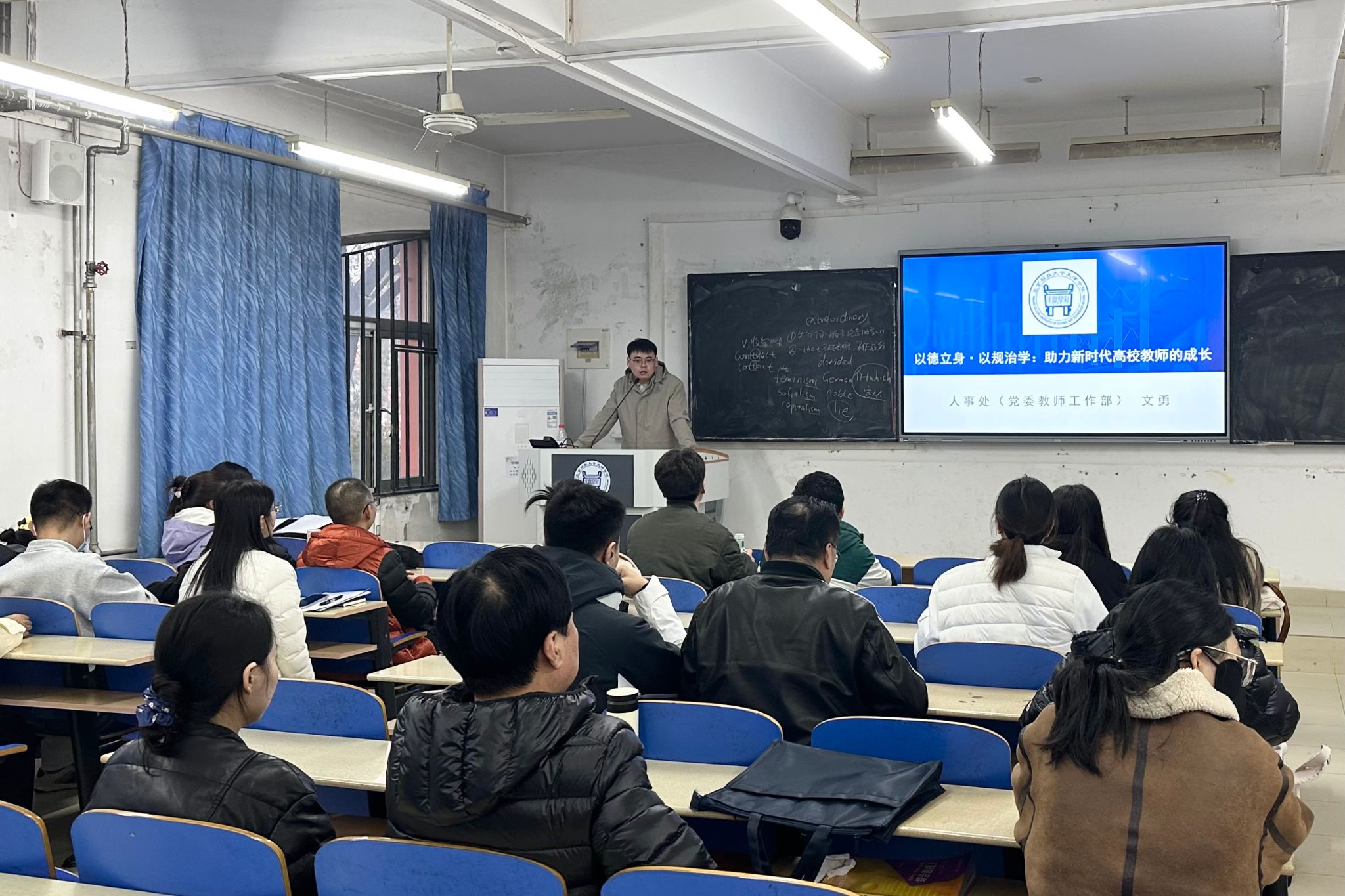 为助力新入职教职工快速适应学院工作环境,系统掌握工作规范及人事管理制度,明确职业发展方向,11月12日下午,学院在9教106开展2025年新入职教职工岗前培训“新教师职能部门规章制度”系列讲座,邀请党委教师工作部师德师风建设科科长文勇老师作题为“以德立身·以规治学:助力新时代高校教师的成长”专题培训。全体新入职教职工参加培训。